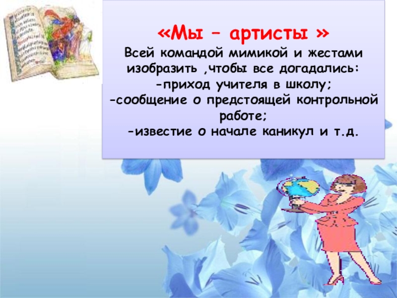 «Мы – артисты » Всей командой мимикой и жестами изобразить ,чтобы все догадались: -приход учителя в школу;