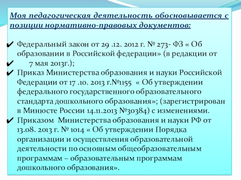 Слайд 7Моя педагогическая деятельность обосновывается с позиции нормативно-правовых документов: