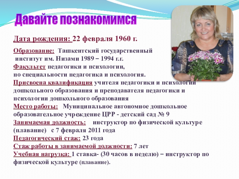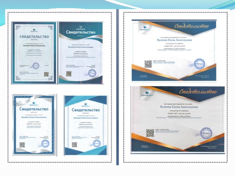 Слайд 4 Валиевой Елены Анатольевны должность: инструктор по физической культуре