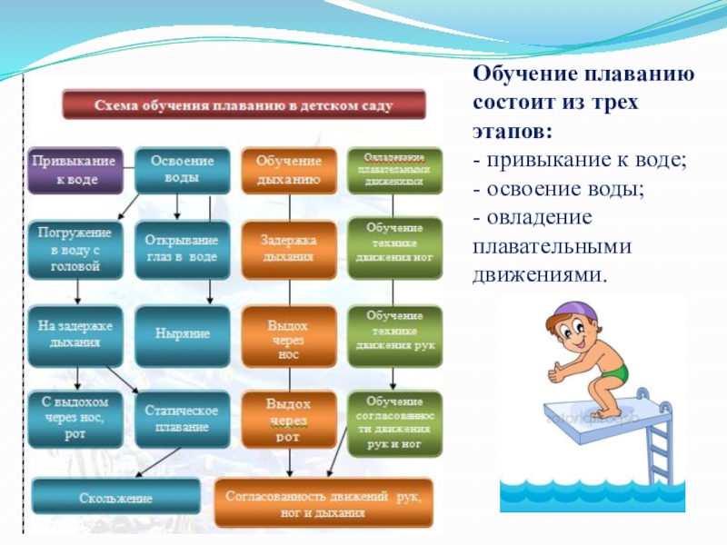 Слайд 13Обучение плаванию состоит из трех этапов: