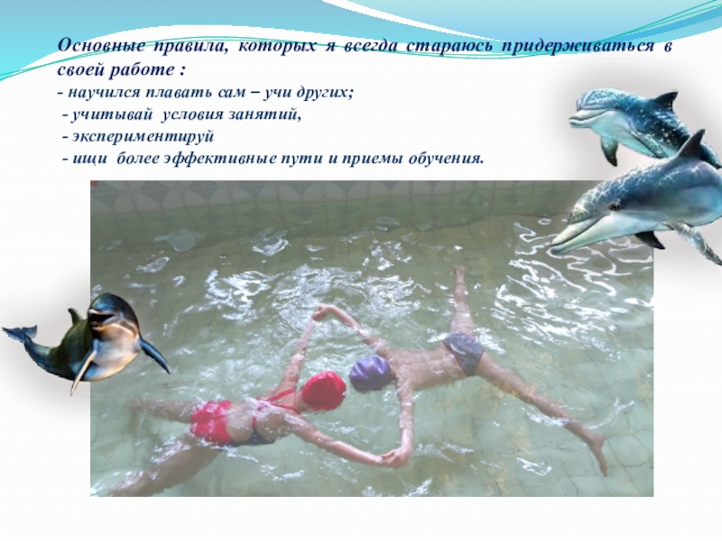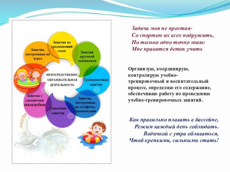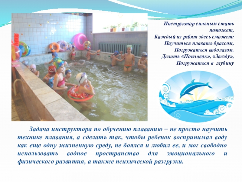 Задача инструктора по обучению плаванию – не просто научить технике плавания, а сделать так, чтобы ребенок воспринимал воду как еще одну жизненную среду, не боялся и любил ее, и мог свободно использовать водное пространство для эмоционального и физического развития, а также психической разгрузки.