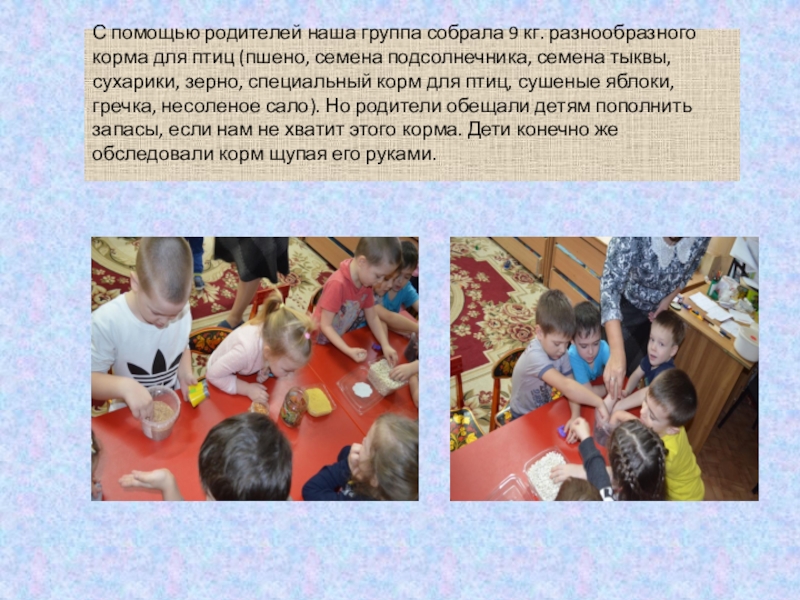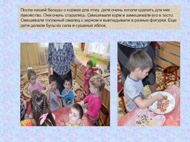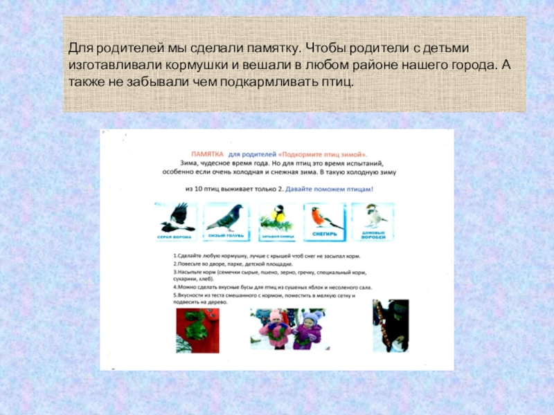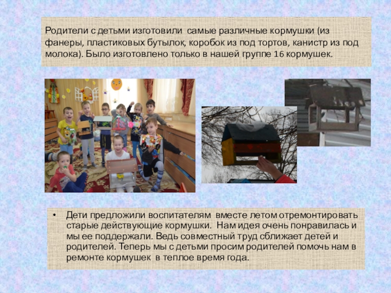 Дети предложили воспитателям вместе летом отремонтировать старые действующие кормушки. Нам идея очень понравилась и мы ее поддержали. Ведь совместный труд сближает детей и родителей. Теперь мы с детьми просим родителей помочь нам в ремонте кормушек в теплое время года.