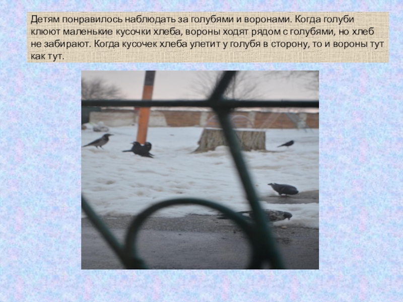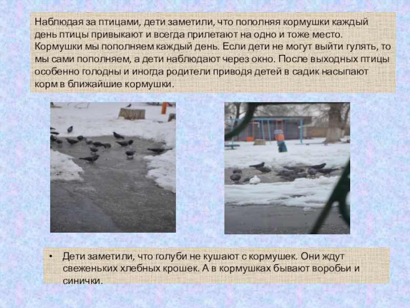 Дети заметили, что голуби не кушают с кормушек. Они ждут свеженьких хлебных крошек. А в кормушках бывают воробьи и синички.