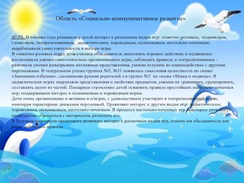 В сюжетно-ролевых играх дети учились объединяться, выполнять игровые действия; в подвижных - воспитывали умение самостоятельно организовывать игры, соблюдать правила; в театрализованных - развивали умение разыгрывать несложные представления, умение вступать во взаимодействие с другими персонажами. В театральном уголке группах №5, №11 появилась смысловая целостность по сказке «Заюшкина избушка», сделанными руками родителей а в группе №3 по сказке «Маша и медведь». В дидактических играх закрепляли представления о свойствах предметов, умении их сравнивать, группировать, составлять целое из частей. Поощряли стремление детей осваивать правила простейших настольно-печатных игр; поддерживали интерес к пальчиковым и хороводным играм.