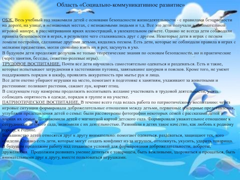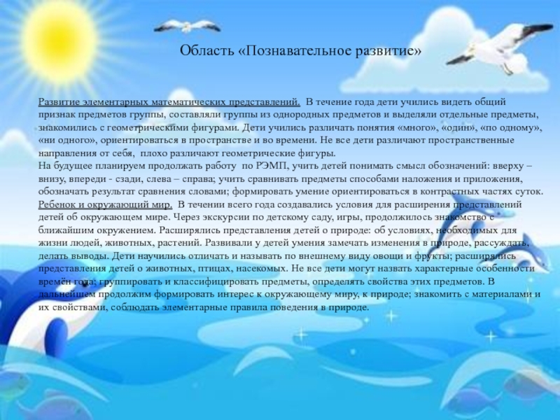 Ребенок и окружающий мир. В течении всего года создавались условия для расширения представлений детей об окружающем мире. Через экскурсии по детскому саду, игры, продолжилось знакомство с ближайшим окружением. Расширялись представления детей о природе: об условиях, необходимых для жизни людей, животных, растений. Развивали у детей умения замечать изменения в природе, рассуждать, делать выводы. Дети научились отличать и называть по внешнему виду овощи и фрукты; расширялись представления детей о животных, птицах, насекомых. Не все дети могут назвать характерные особенности времён года; группировать и классифицировать предметы, определять свойства этих предметов. В дальнейшем продолжим формировать интерес к окружающему миру, к природе; знакомить с материалами и их свойствами, соблюдать элементарные правила поведения в природе.