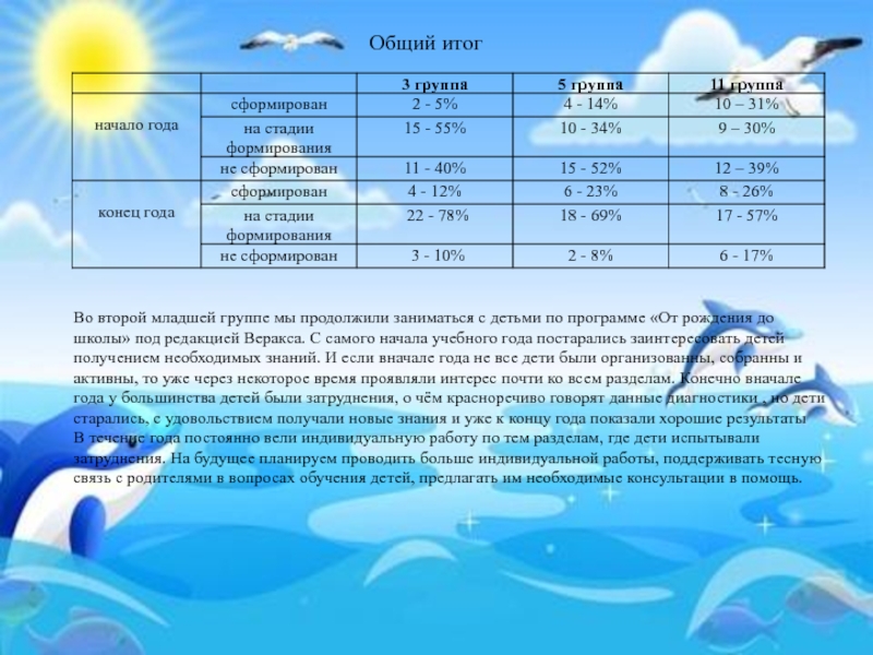 программе «От рождения до школы» под редакцией Веракса. С самого начала учебного года постарались заинтересовать детей получением необходимых знаний. И если вначале года не все дети были организованны, собранны и активны, то уже через некоторое время проявляли интерес почти ко всем разделам. Конечно вначале года у большинства детей были затруднения, о чём красноречиво говорят данные диагностики , но дети старались, с удовольствием получали новые знания и уже к концу года показали хорошие результаты