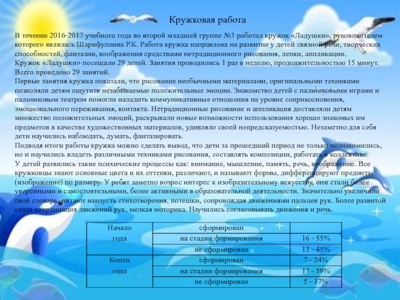 работал кружок «Ладушки», руководителем которого являлась Шарифуллина Р.К. Работа кружка направлена на развитие у детей связной речи, творческих способностей, фантазии, воображения средствами нетрадиционного рисования, лепки, аппликации.