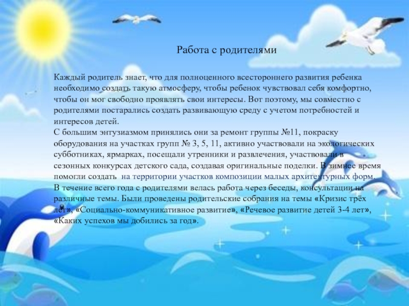 В течение всего года с родителями велась работа через беседы, консультации на различные темы. Были проведены родительские собрания на темы «Кризис трёх лет», «Социально-коммуникативное развитие», «Речевое развитие детей 3-4 лет», «Каких успехов мы добились за год».