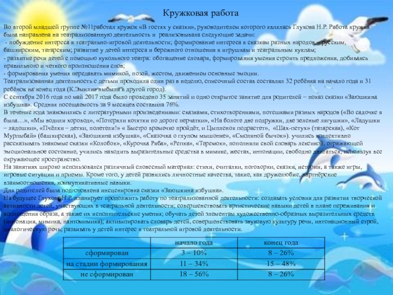 С сентября 2016 года по май 2017 года было проведено 35 занятий и одно открытое занятие для родителей – показ сказки «Заюшкина избушка». Средняя посещаемость за 9 месяцев составила 76%.