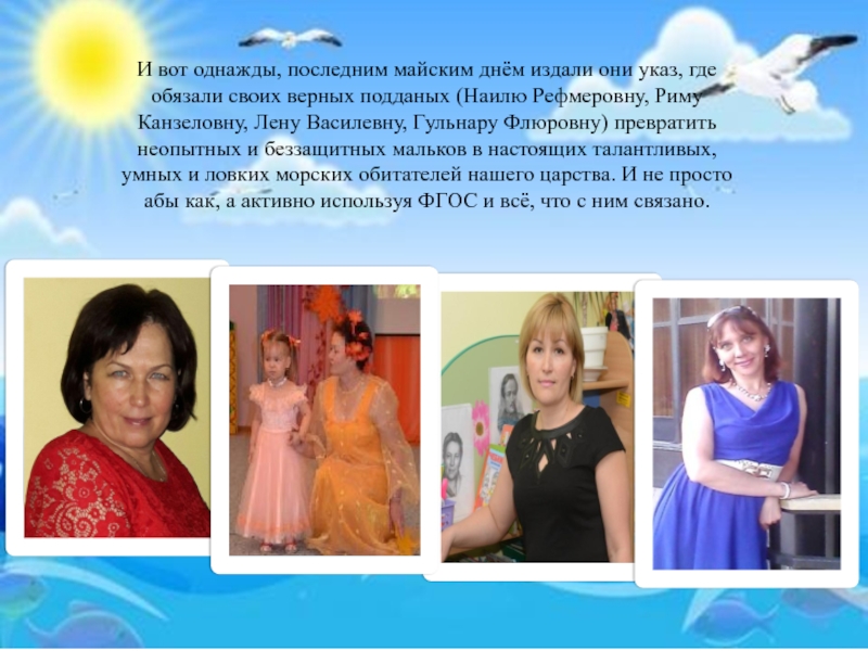 своих верных подданых (Наилю Рефмеровну, Риму Канзеловну, Лену Василевну, Гульнару Флюровну) превратить неопытных и беззащитных мальков в настоящих талантливых, умных и ловких морских обитателей нашего царства. И не просто абы как, а активно используя ФГОС и всё, что с ним связано.