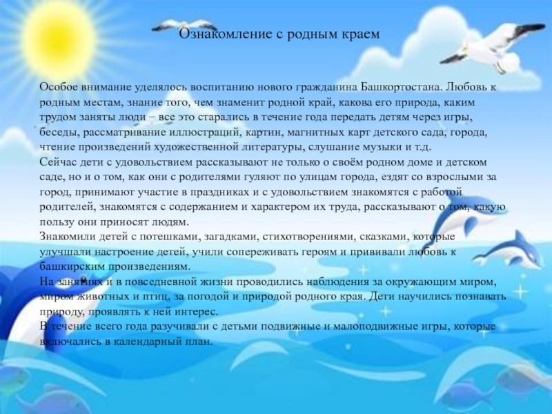 к родным местам, знание того, чем знаменит родной край, какова его природа, каким трудом заняты люди – все это старались в течение года передать детям через игры, беседы, рассматривание иллюстраций, картин, магнитных карт детского сада, города, чтение произведений художественной литературы, слушание музыки и т.д.