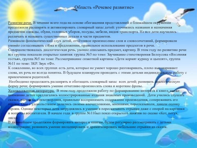 Развивали фонематический слух детей, отчётливое произнесение слов и словосочетаний, формировали умение согласовывать слова в предложении, правильное использование предлогов в речи. Совершенствовалась диалогическая речь, умение описывать предмет, картину. В этом году по развитию речи все группы показали открытые занятия: группа №3 по теме: Заучивание стихотворения Белоусова «Весенняя гостья», группа №5 по теме: Рассматривание сюжетной картины «Дети кормят курицу и цыплят», группа №11 по теме: ЗКР. Звук «Ф».