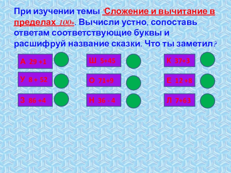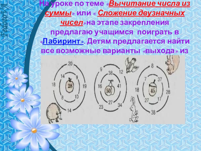 На уроке по теме «Вычитание числа из суммы» на этапе закрепления учитель может предложить детям поиграть в «Лабиринт». Детям предлагается найти все возможные варианты «выхода» из лабиринта.