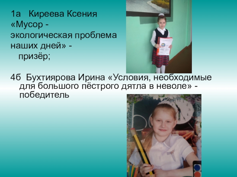 4б Бухтиярова Ирина «Условия, необходимые для большого пёстрого дятла в неволе» - победитель