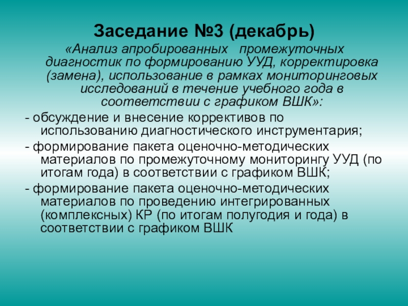- формирование пакета оценочно-методических материалов по входному мониторингу в соответствии с графиком ВШК (тексты мониторинговых работ, дескрипторы, клеше аналитических материалов по классам обучения);