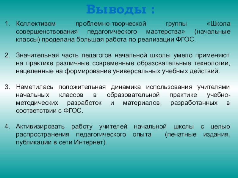 Активизировать работу учителей начальной школы с целью распространения педагогического опыта (печатные издания, публикации в сети Интернет).