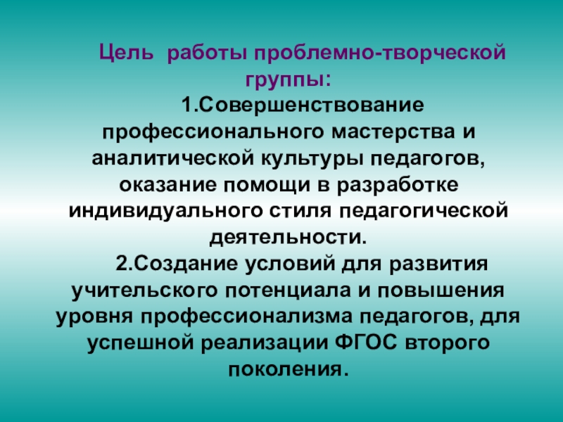 2.Создание условий для развития учительского потенциала и повышения уровня профессионализма педагогов, для успешной реализации ФГОС второго поколения.