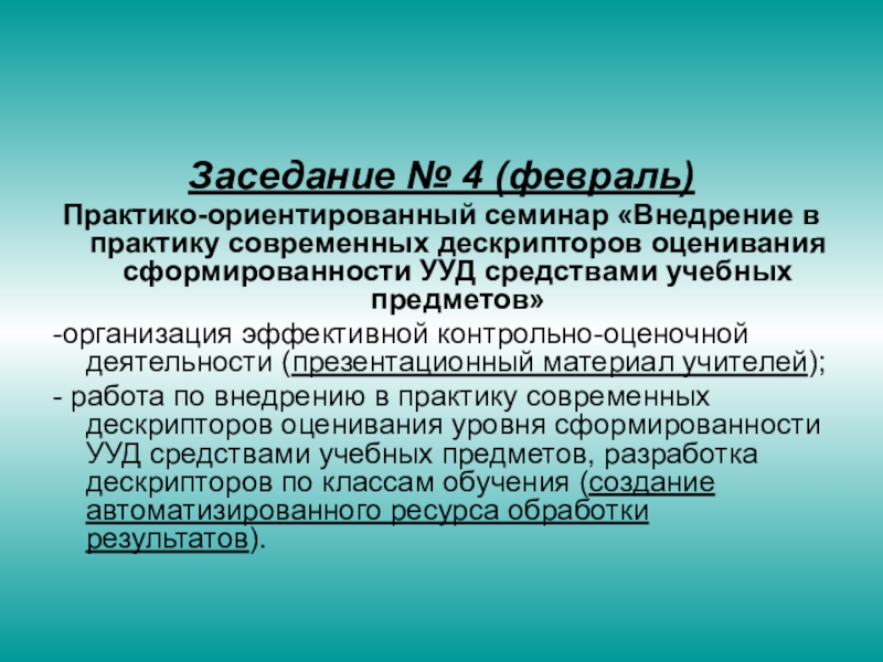 - работа по внедрению в практику современных дескрипторов оценивания уровня сформированности УУД средствами учебных предметов, разработка дескрипторов по классам обучения (создание автоматизированного ресурса обработки результатов).