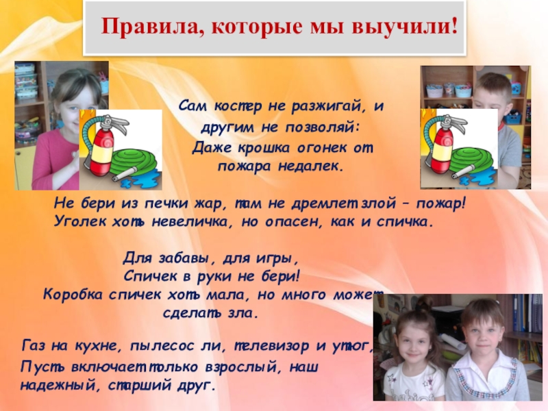 Не бери из печки жар, там не дремлет злой – пожар! Уголек хоть невеличка, но опасен, как и спичка.