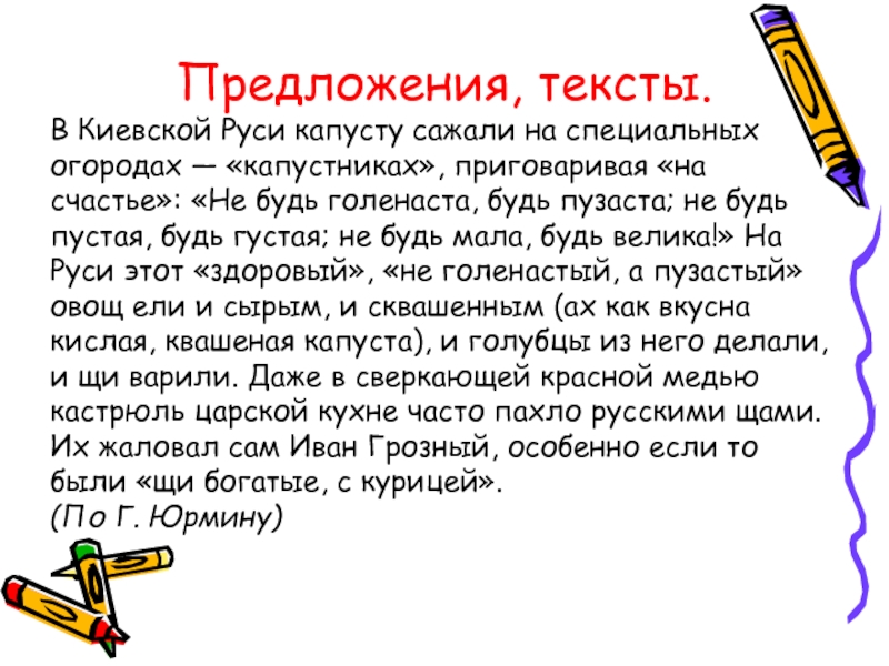 «капустниках», приговаривая «на счастье»: «Не будь голенаста, будь пузаста; не будь пустая, будь густая; не будь мала, будь велика!» На Руси этот «здоровый», «не голенастый, а пузастый» овощ ели и сырым, и сквашенным (ах как вкусна кислая, квашеная капуста), и голубцы из него делали, и щи варили. Даже в сверкающей красной медью кастрюль царской кухне часто пахло русскими щами. Их жаловал сам Иван Грозный, особенно если то были «щи богатые, с курицей».