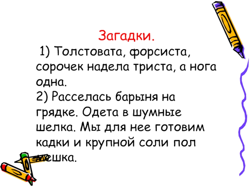 2) Расселась барыня на грядке. Одета в шумные шелка. Мы для нее готовим кадки и крупной соли пол мешка.