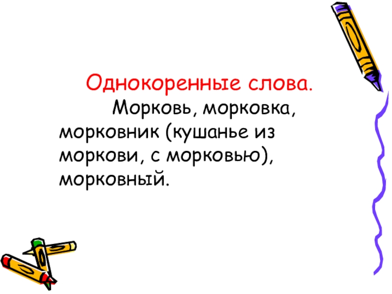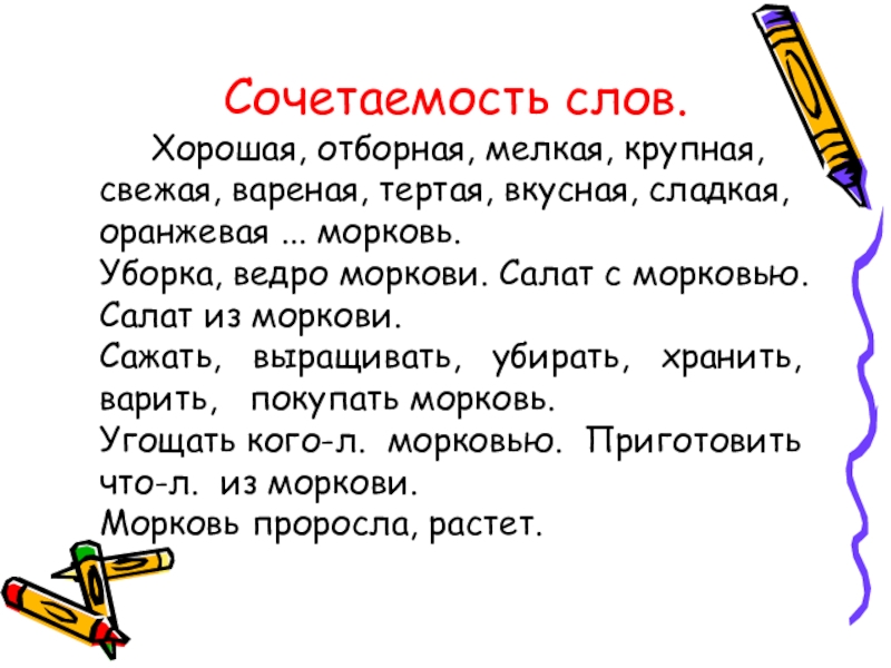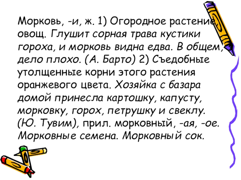Слайд 12Морковь, -и, ж. 1) Огородное растение, овощ. Глушит сорная трава кустики