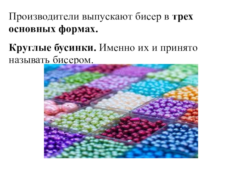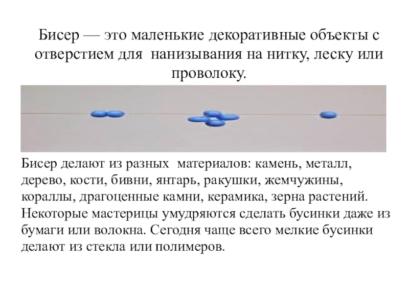 Бисер делают из разных материалов: камень, металл, дерево, кости, бивни, янтарь, ракушки, жемчужины, кораллы, драгоценные камни, керамика, зерна растений. Некоторые мастерицы умудряются сделать бусинки даже из бумаги или волокна. Сегодня чаще всего мелкие бусинки делают из стекла или полимеров.