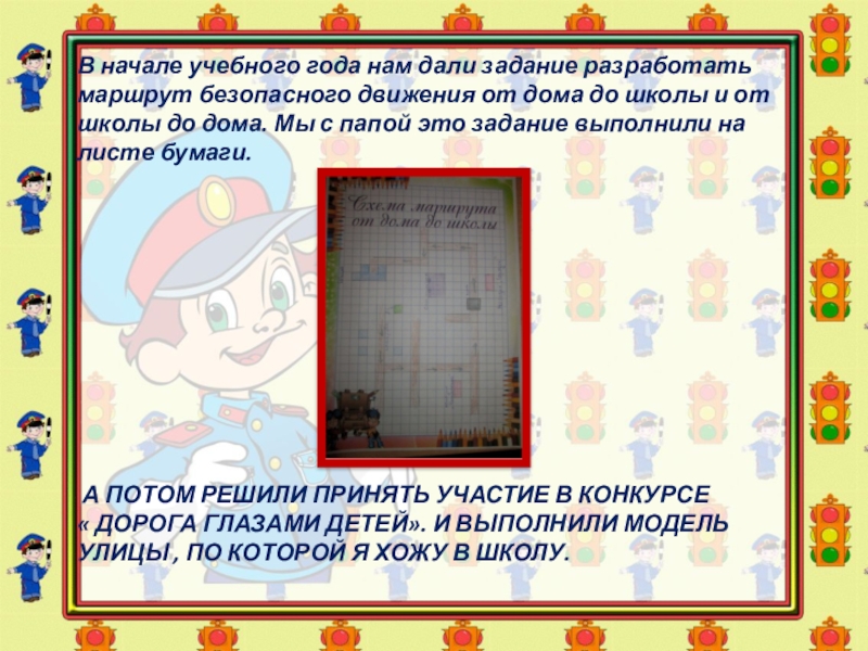 В начале учебного года нам дали задание разработать маршрут безопасного движения от дома до школы и от школы до дома. Мы с папой это задание выполнили на листе бумаги.