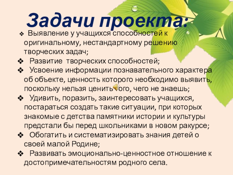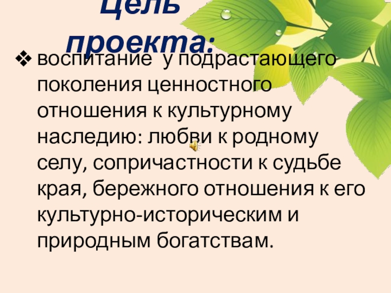 к родному селу, сопричастности к судьбе края, бережного отношения к его культурно-историческим и природным богатствам.