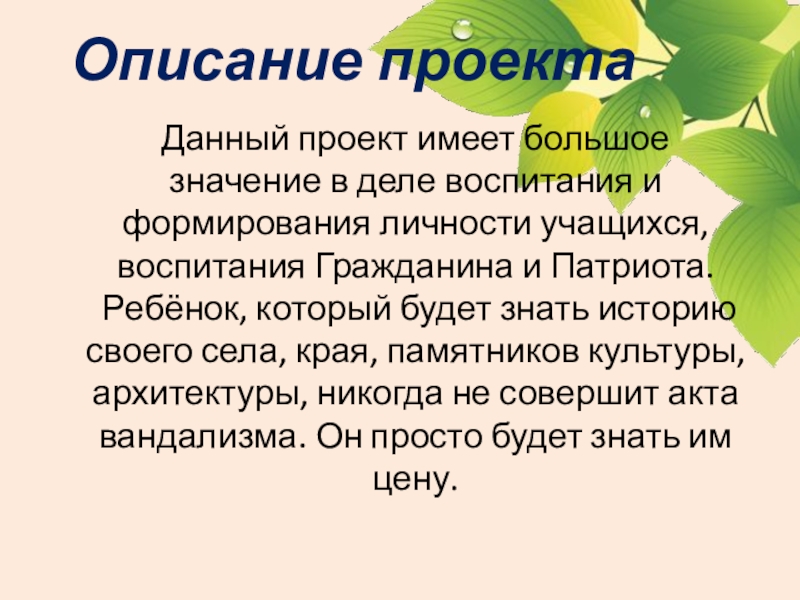 Ребёнок, который будет знать историю своего села, края, памятников культуры, архитектуры, никогда не совершит акта вандализма. Он просто будет знать им цену.