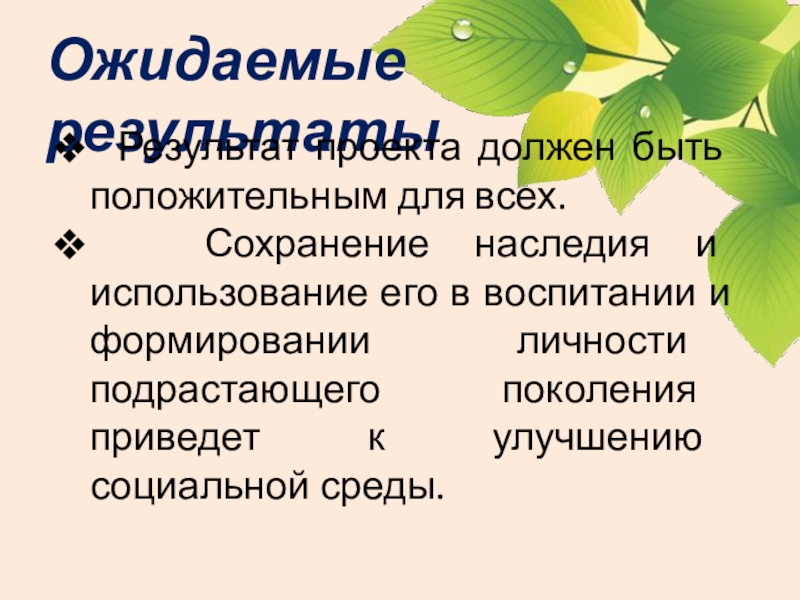 Сохранение наследия и использование его в воспитании и формировании личности подрастающего поколения приведет к улучшению социальной среды.