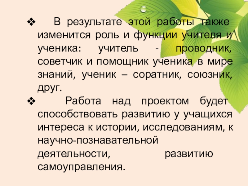 Работа над проектом будет способствовать развитию у учащихся интереса к истории, исследованиям, к научно-познавательной деятельности, развитию самоуправления.