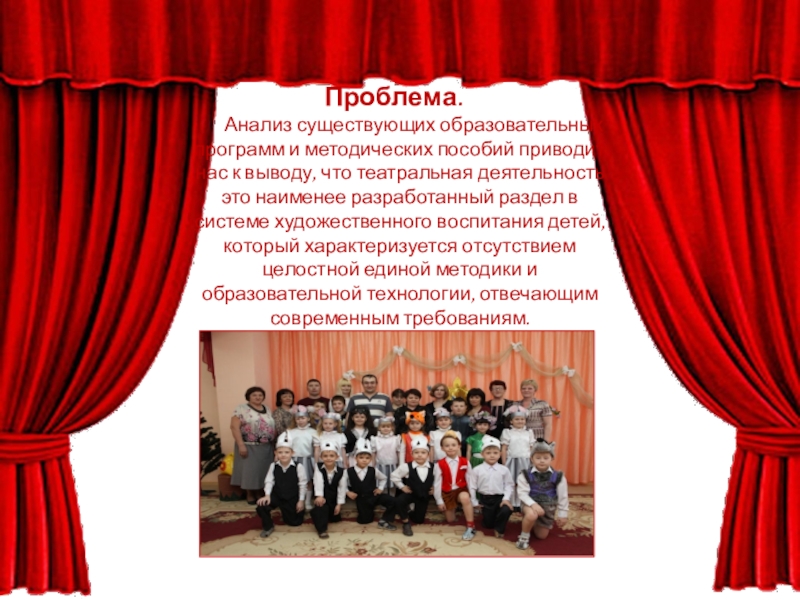 Анализ существующих образовательных программ и методических пособий приводит нас к выводу, что театральная деятельность это наименее разработанный раздел в системе художественного воспитания детей, который характеризуется отсутствием целостной единой методики и образовательной технологии, отвечающим современным требованиям.