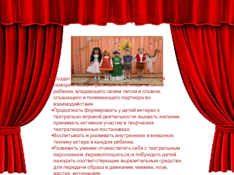 Продолжать формировать у детей интерес к театрально-игровой деятельности; вызвать желание принимать активное участие в творческих театрализованных постановках.