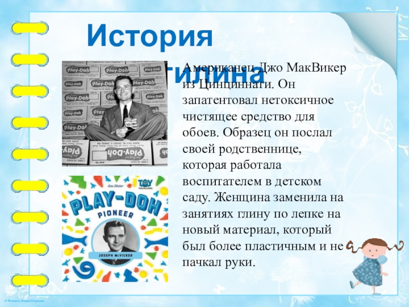 для обоев. Образец он послал своей родственнице, которая работала воспитателем в детском саду. Женщина заменила на занятиях глину по лепке на новый материал, который был более пластичным и не пачкал руки.