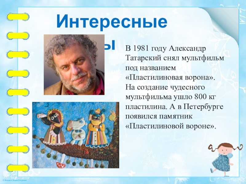 ворона». На создание чудесного мультфильма ушло 800 кг пластилина. А в Петербурге появился памятник «Пластилиновой вороне».