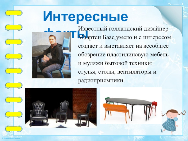 и выставляет на всеобщее обозрение пластилиновую мебель и муляжи бытовой техники: стулья, столы, вентиляторы и радиоприемники.