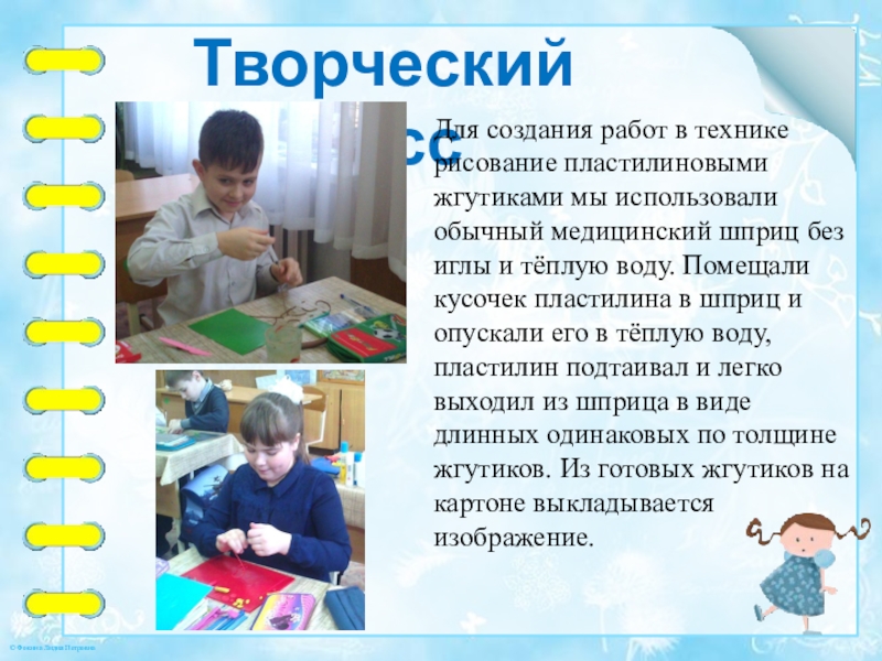 обычный медицинский шприц без иглы и тёплую воду. Помещали кусочек пластилина в шприц и опускали его в тёплую воду, пластилин подтаивал и легко выходил из шприца в виде длинных одинаковых по толщине жгутиков. Из готовых жгутиков на картоне выкладывается изображение.