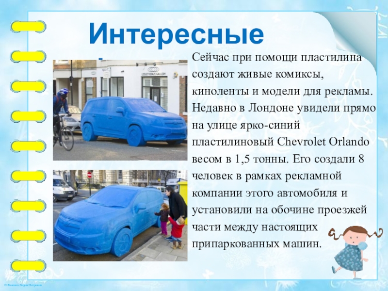 для рекламы. Недавно в Лондоне увидели прямо на улице ярко-синий пластилиновый Chevrolet Orlando весом в 1,5 тонны. Его создали 8 человек в рамках рекламной компании этого автомобиля и установили на обочине проезжей части между настоящих припаркованных машин.