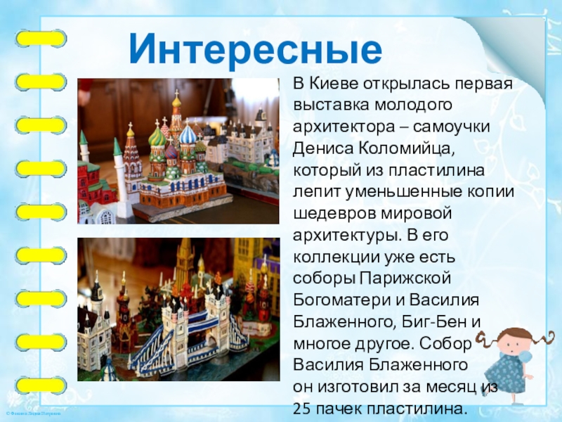 Коломийца, который из пластилина лепит уменьшенные копии шедевров мировой архитектуры. В его коллекции уже есть соборы Парижской Богоматери и Василия Блаженного, Биг-Бен и многое другое. Собор Василия Блаженного