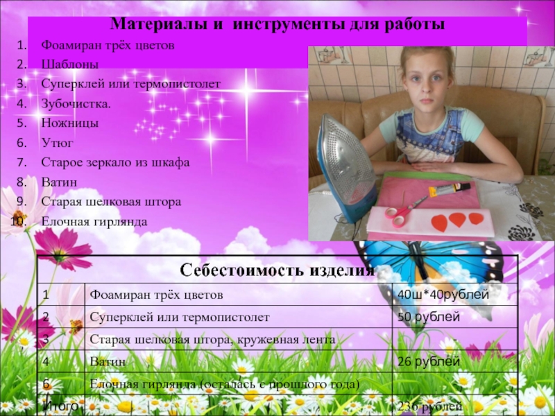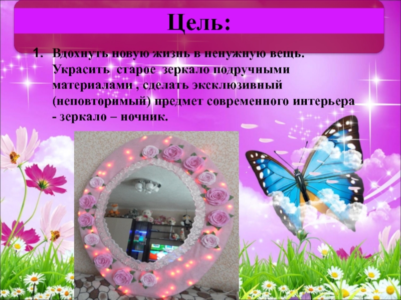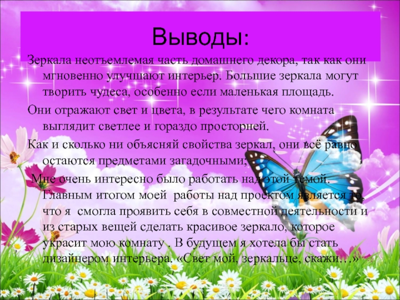 Мне очень интересно было работать над этой темой. Главным итогом моей работы над проектом является то, что я смогла проявить себя в совместной деятельности и из старых вещей сделать красивое зеркало, которое украсит мою комнату . В будущем я хотела бы стать дизайнером интерьера. «Свет мой, зеркальце, скажи…»