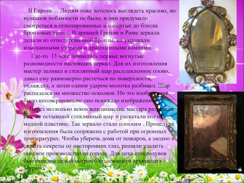 Его история теряется в глубине веков. Первые зеркала делали еще в Древнем Шумере, Индии и Египте, позже уже в XII веке венецианские мастера, жившие и работавшие на острове Мурано.