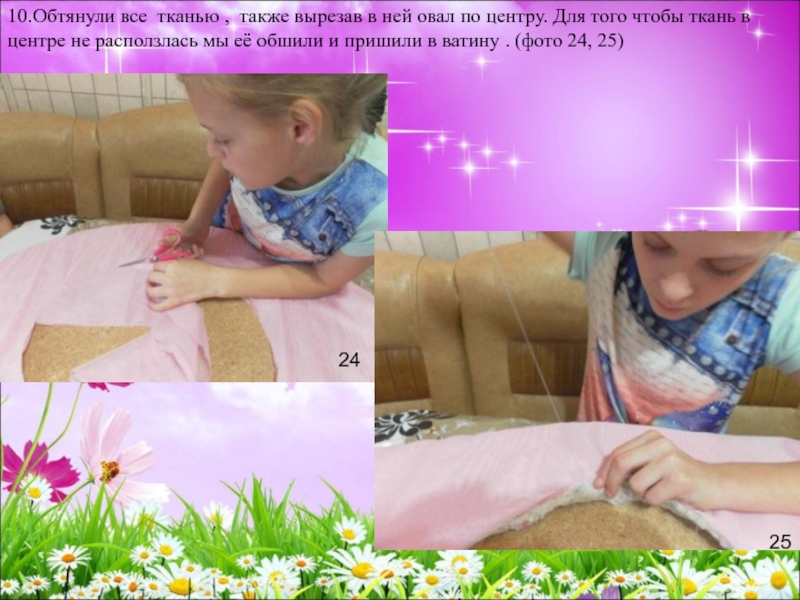 Слайд 2810.Обтянули все тканью , также вырезав в ней овал по центру.