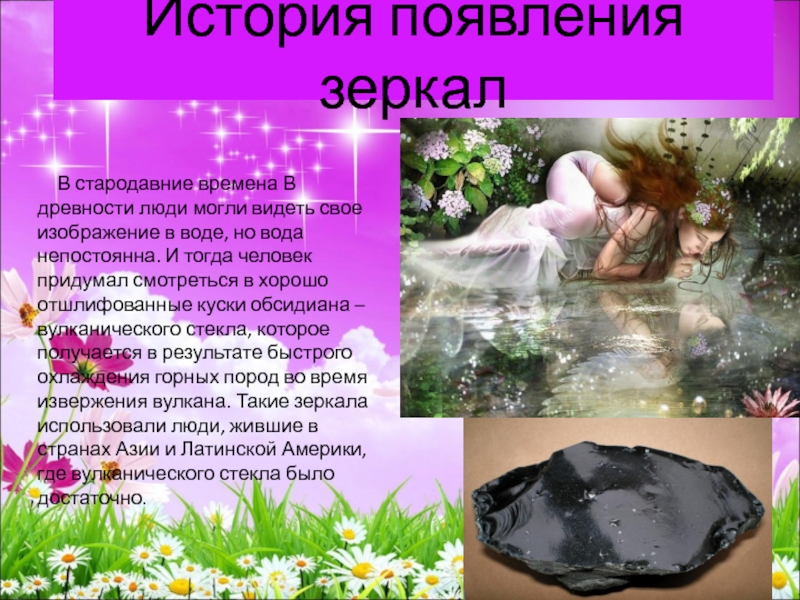 В древности люди могли видеть свое изображение в воде, но вода непостоянна. И тогда человек придумал смотреться в хорошо отшлифованные куски обсидиана – вулканического стекла, которое получается в результате быстрого охлаждения горных пород во время извержения вулкана. Такие зеркала использовали люди, жившие в странах Азии и Латинской Америки, где вулканического стекла было достаточно.