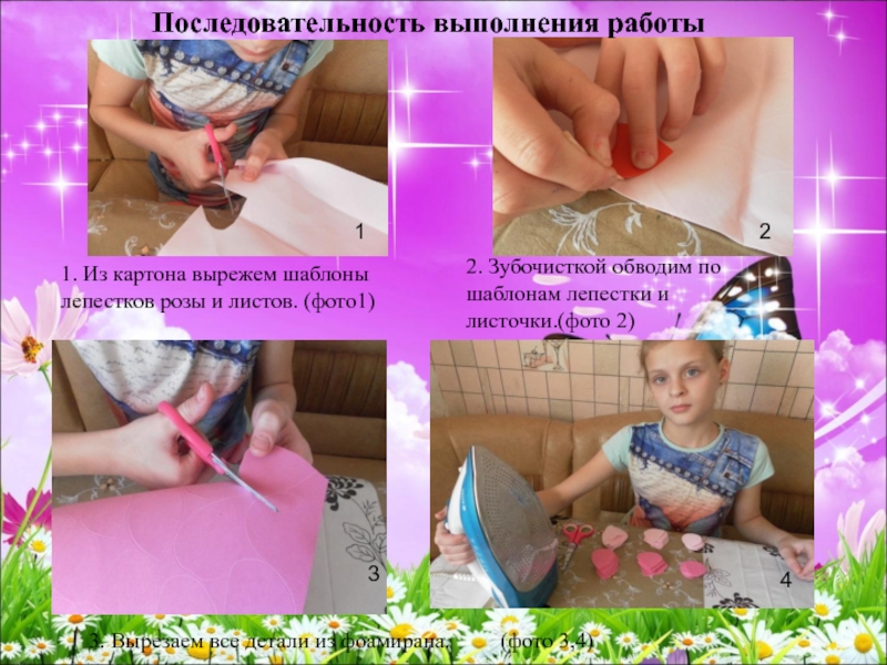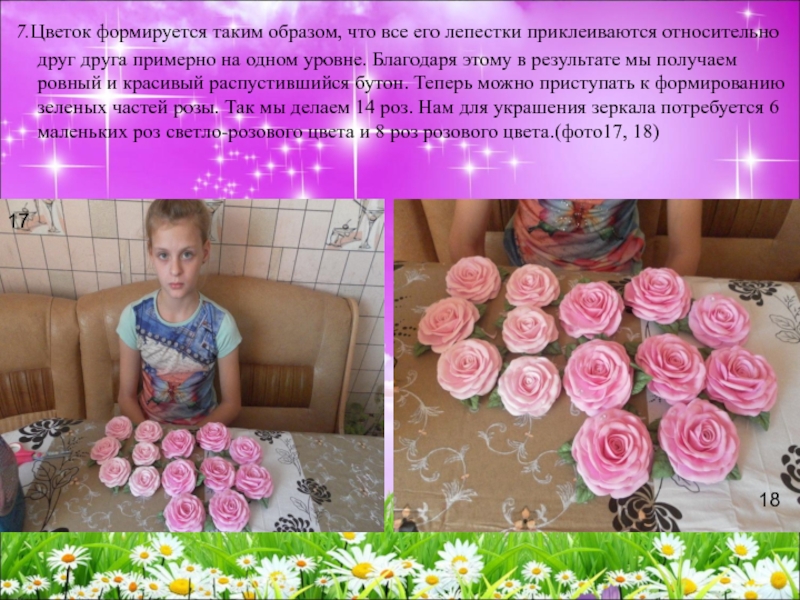 друг друга примерно на одном уровне. Благодаря этому в результате мы получаем ровный и красивый распустившийся бутон. Теперь можно приступать к формированию зеленых частей розы. Так мы делаем 14 роз. Нам для украшения зеркала потребуется 6 маленьких роз светло-розового цвета и 8 роз розового цвета.(фото17, 18)