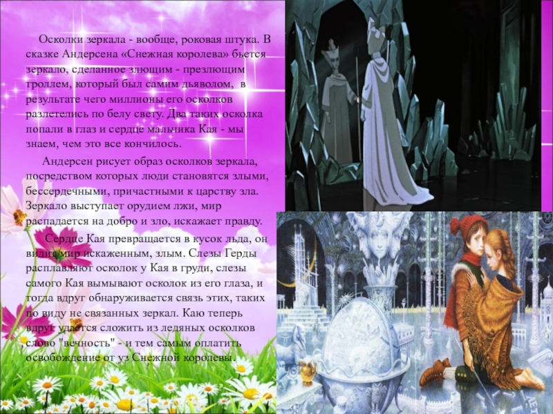 Андерсен рисует образ осколков зеркала, посредством которых люди становятся злыми, бессердечными, причастными к царству зла. Зеркало выступает орудием лжи, мир распадается на добро и зло, искажает правду.