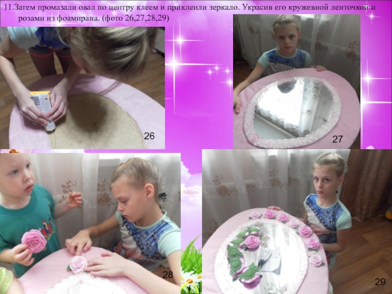 11.Затем промазали овал по центру клеем и приклеили зеркало. Украсив его