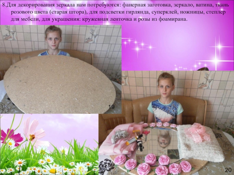8.Для декорирования зеркала нам потребуются: фанерная заготовка, зеркало, ватина, ткань розового