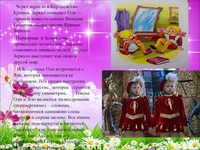 В Зазеркалье Оля встречается с Яло, которая оказывается ее двойником. Вся сказка построена на двойничестве, которое строится по принципу симметрии. Имена Оли и Яло являются палиндромами (перевертнями) – словами, читающимися одинаково слева направо и справа налево. Все имена в сказке перевернуты и читаются “наоборот” как у положительных (Гурд, Бар, Аксал), так и у отрицательных героев (Топсед, Нушрок, Абаж, Анидаг).