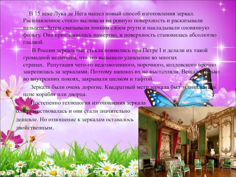 Зеркала были очень дорогие. Квадратный метр зеркала был эквивалентен цене корабля или дворца.